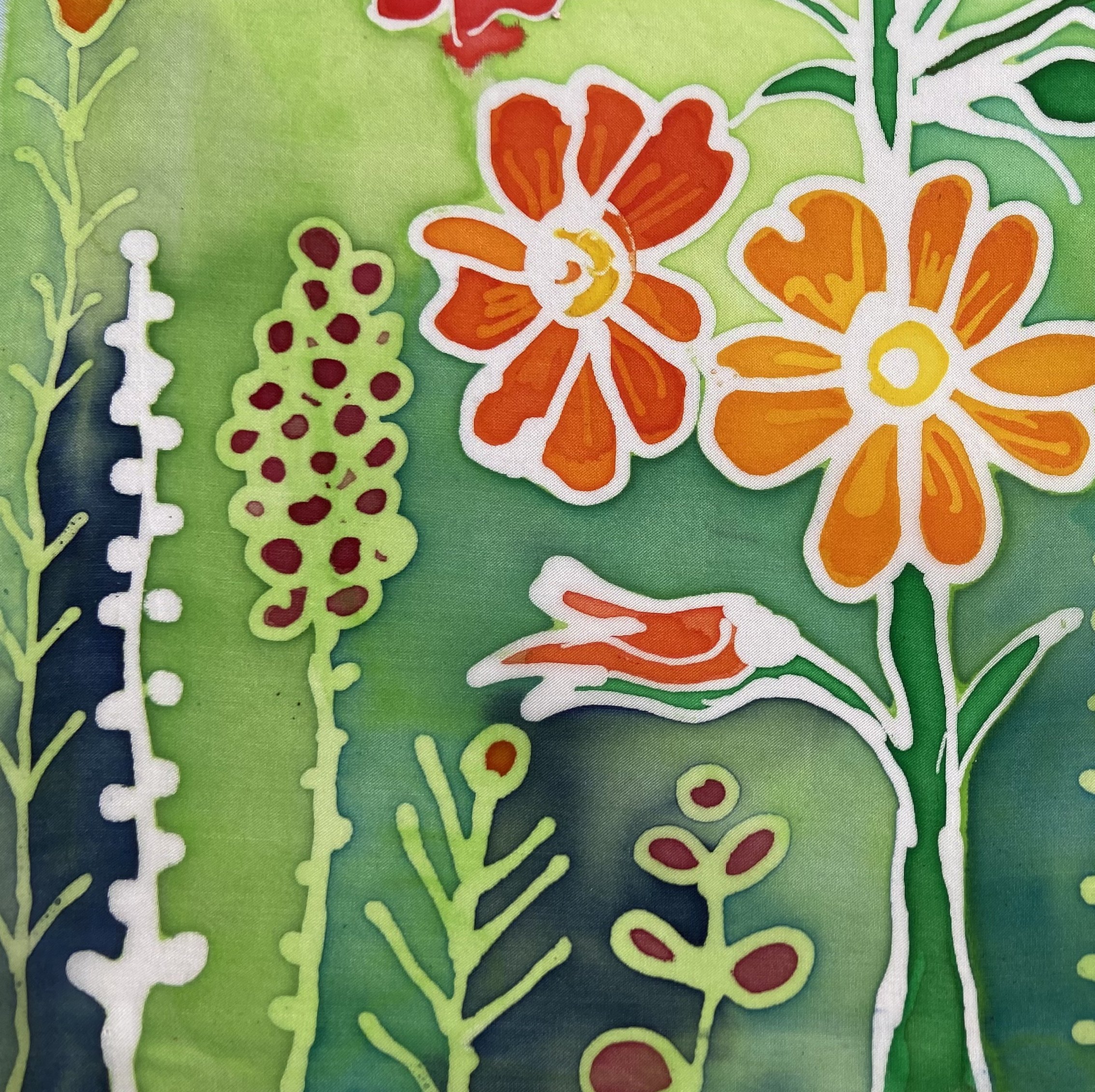Learn the art of silk painting using wax resist and inks. The wax is applied using “Batik” methods but instead of dipping the fabric into dye, the colour is applied by painting silk inks directly onto the fabric giving much fresher and vibrant results.